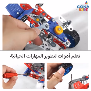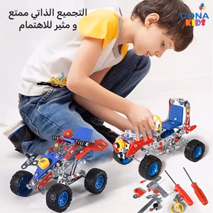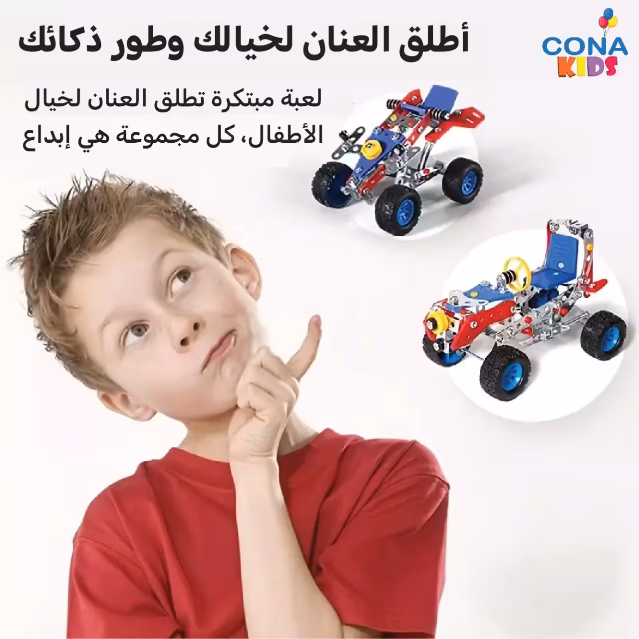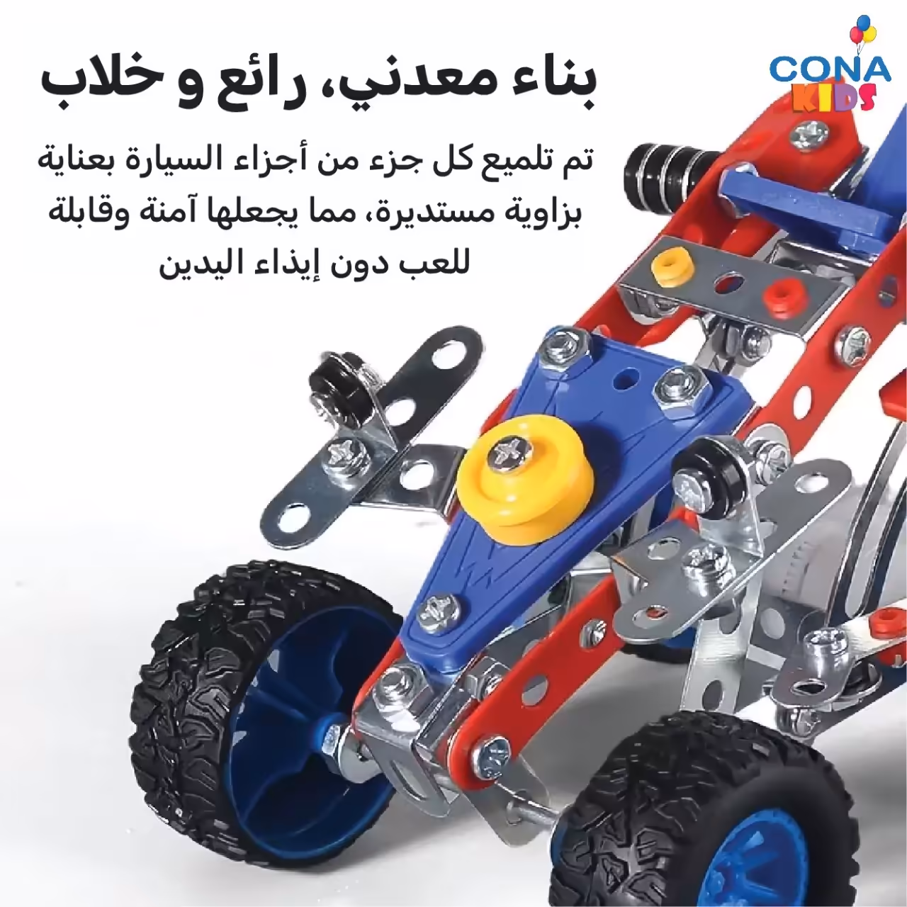 – القطع تشمل الأجزاء الأساسية مثل الصواميل، البراغي، العجلات، المحركات، والأجزاء الهيكلية التي تتيح للطفل تصميم سيارة أو موديلات أخرى.