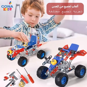 – القطع تشمل الأجزاء الأساسية مثل الصواميل، البراغي، العجلات، المحركات، والأجزاء الهيكلية التي تتيح للطفل تصميم سيارة أو موديلات أخرى.