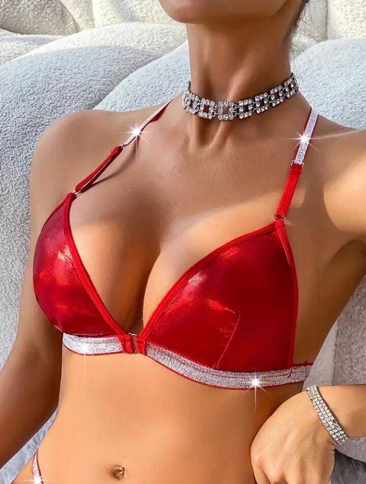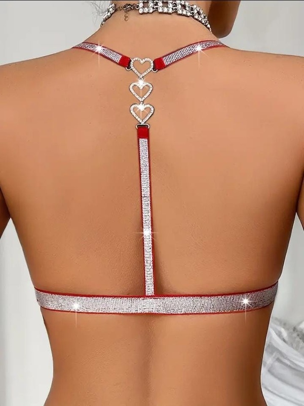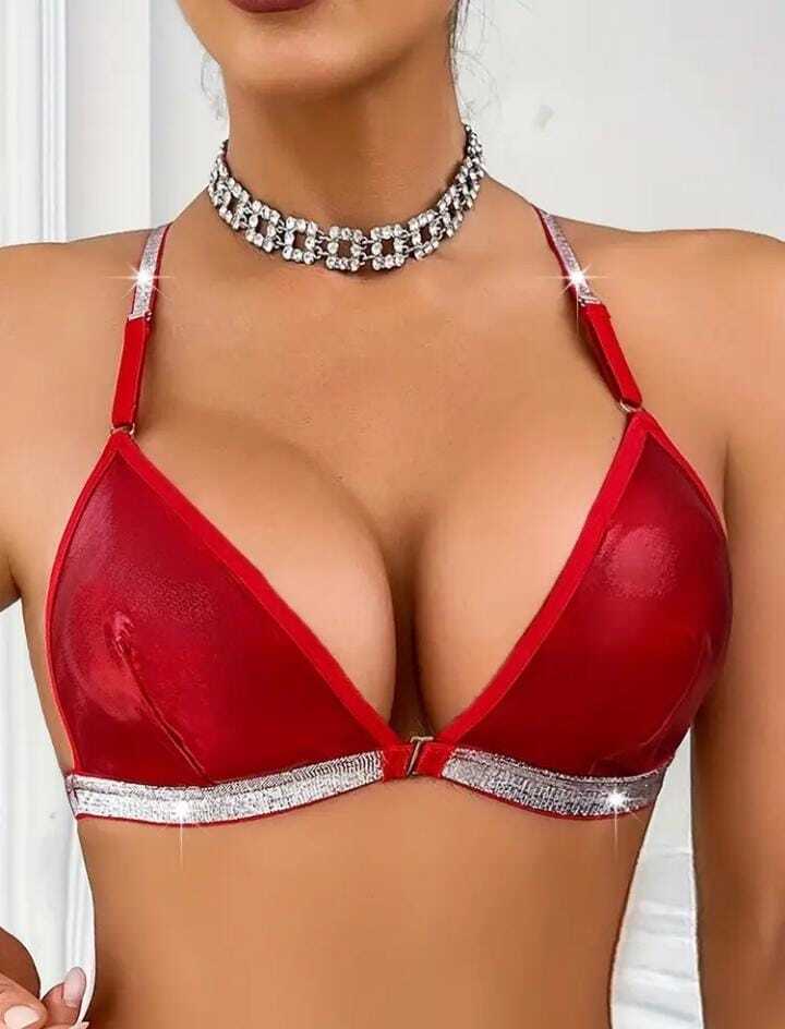 أضيفي لمسة من البريق والسحر إلى إطلالتك مع مالة صدر مثيرة بدون أسلاك أو حشوة، مرصعة بأحجار الراين اللامعة بلون ذهبي وأحمر فاخر، مثالية للحفلات والمناسبات الخاصة.