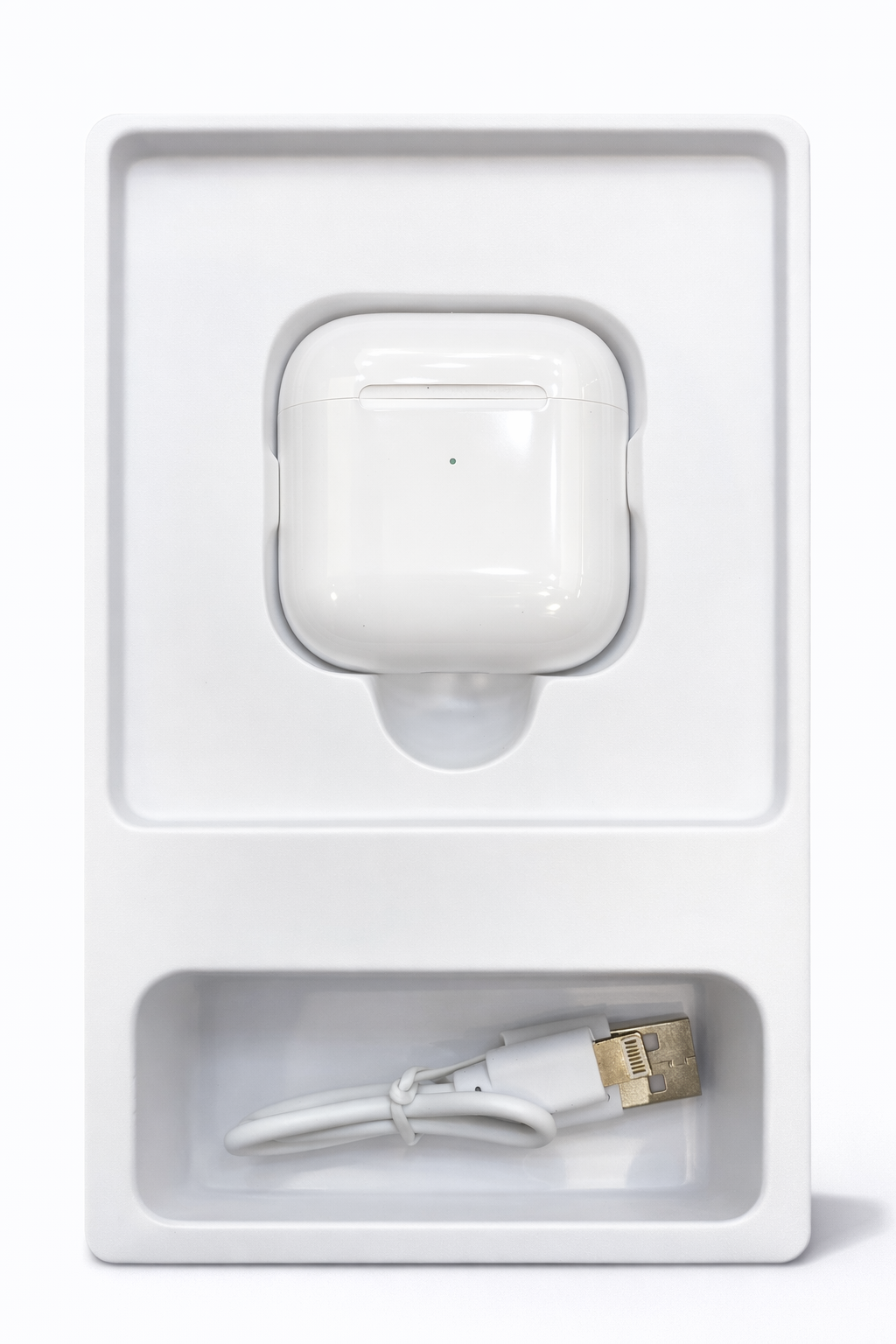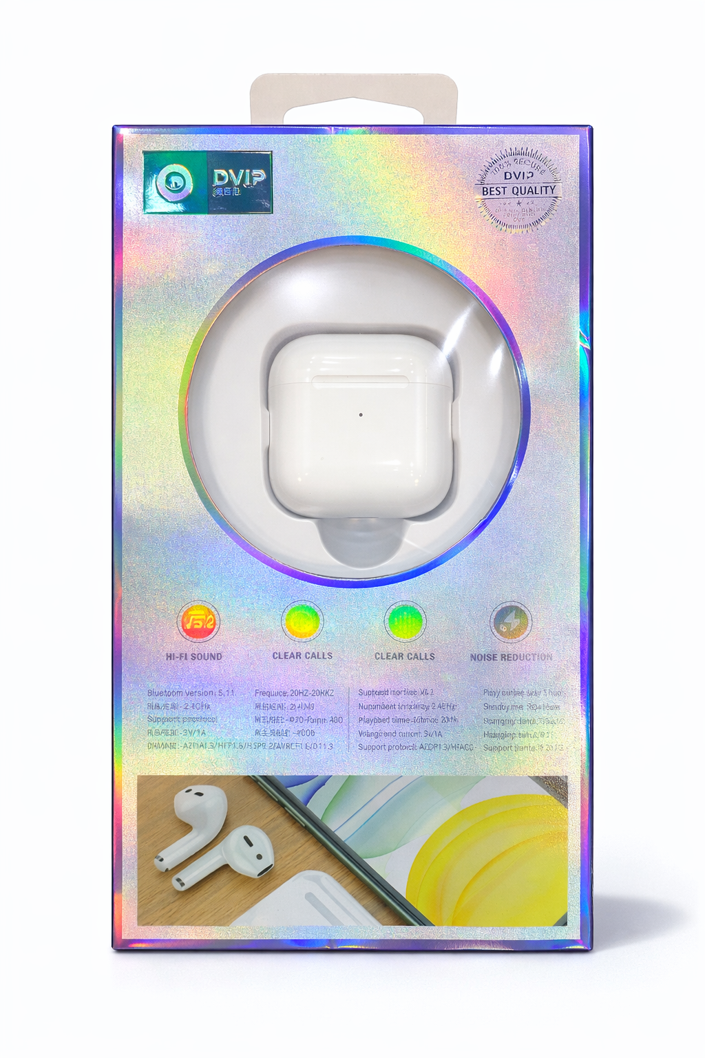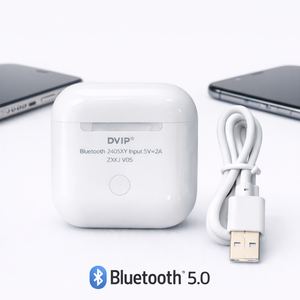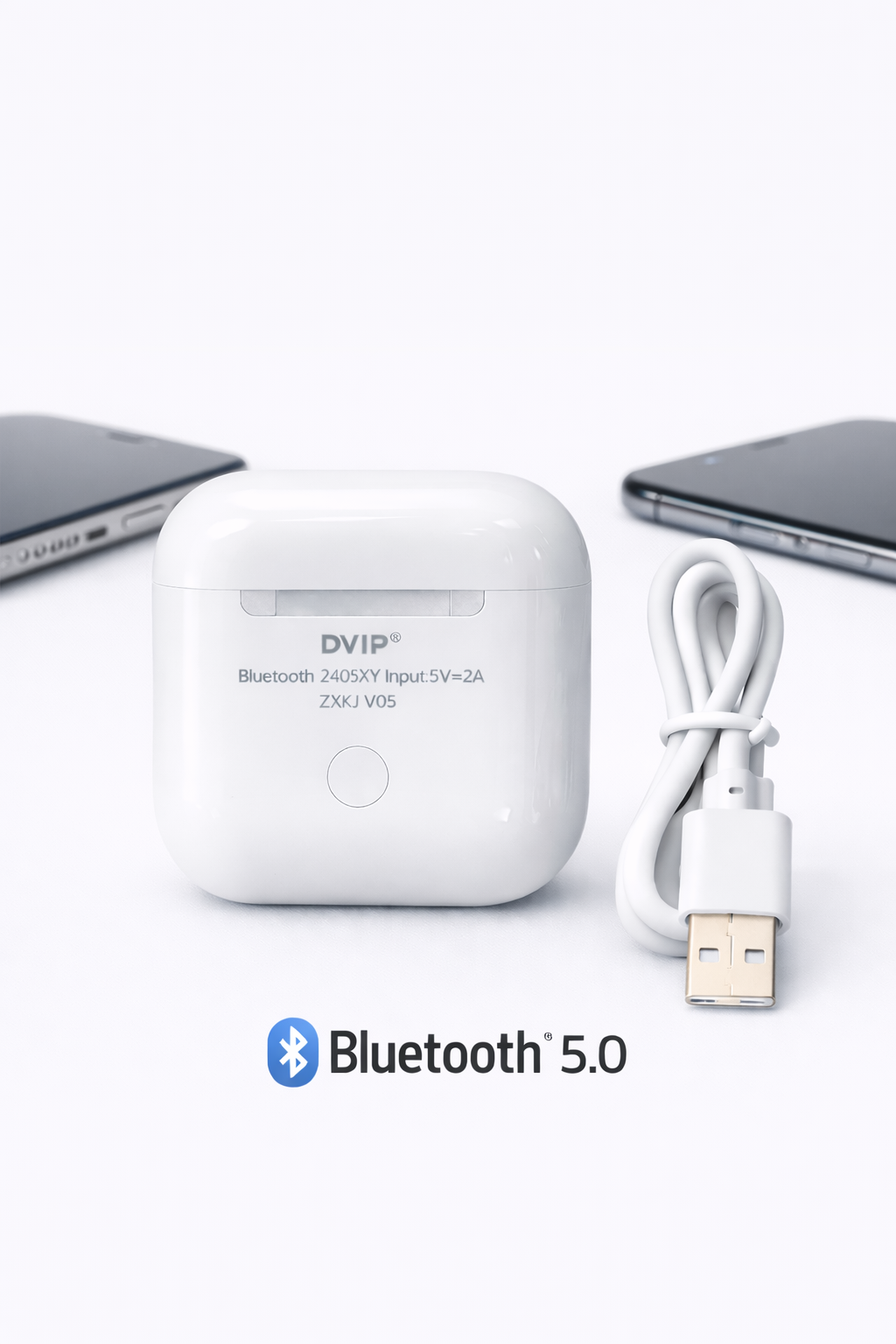 سماعات الأذن اللاسلكية DVIP V05 تتميز بجودة صوت جيدة واتصال بلوتوث 5.3. تأتي السماعات بتصميم مشابه لتصميم سماعات آبل، مع علبة شحن مدمجة.