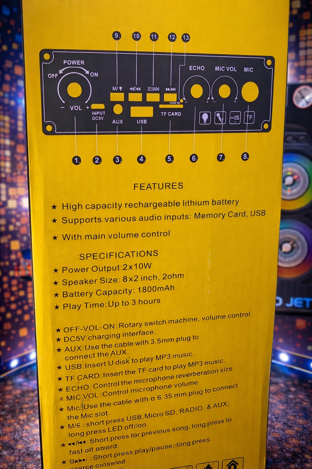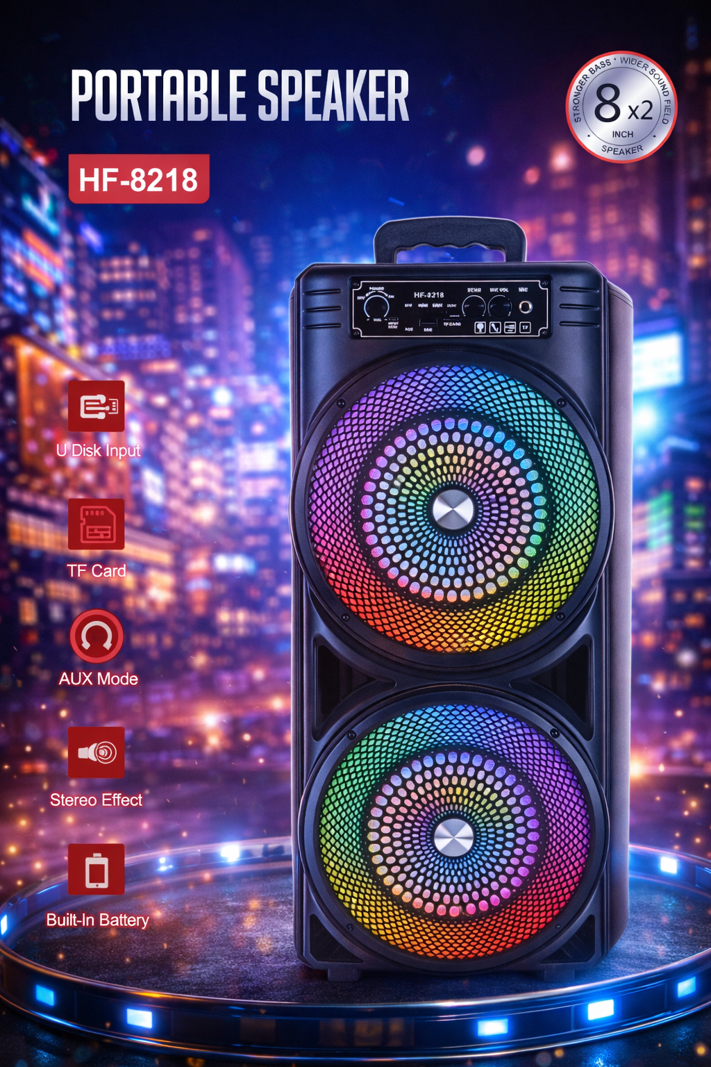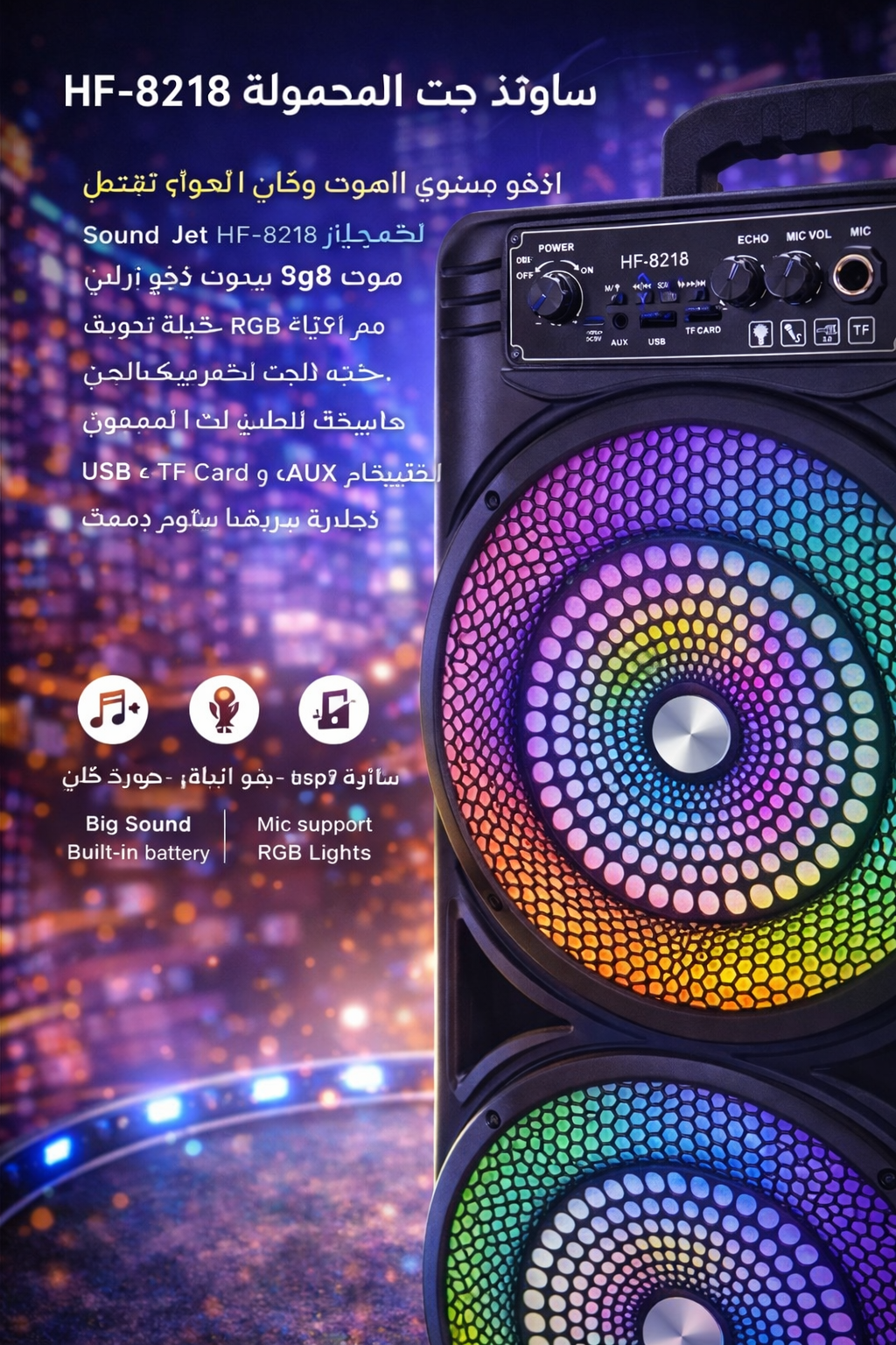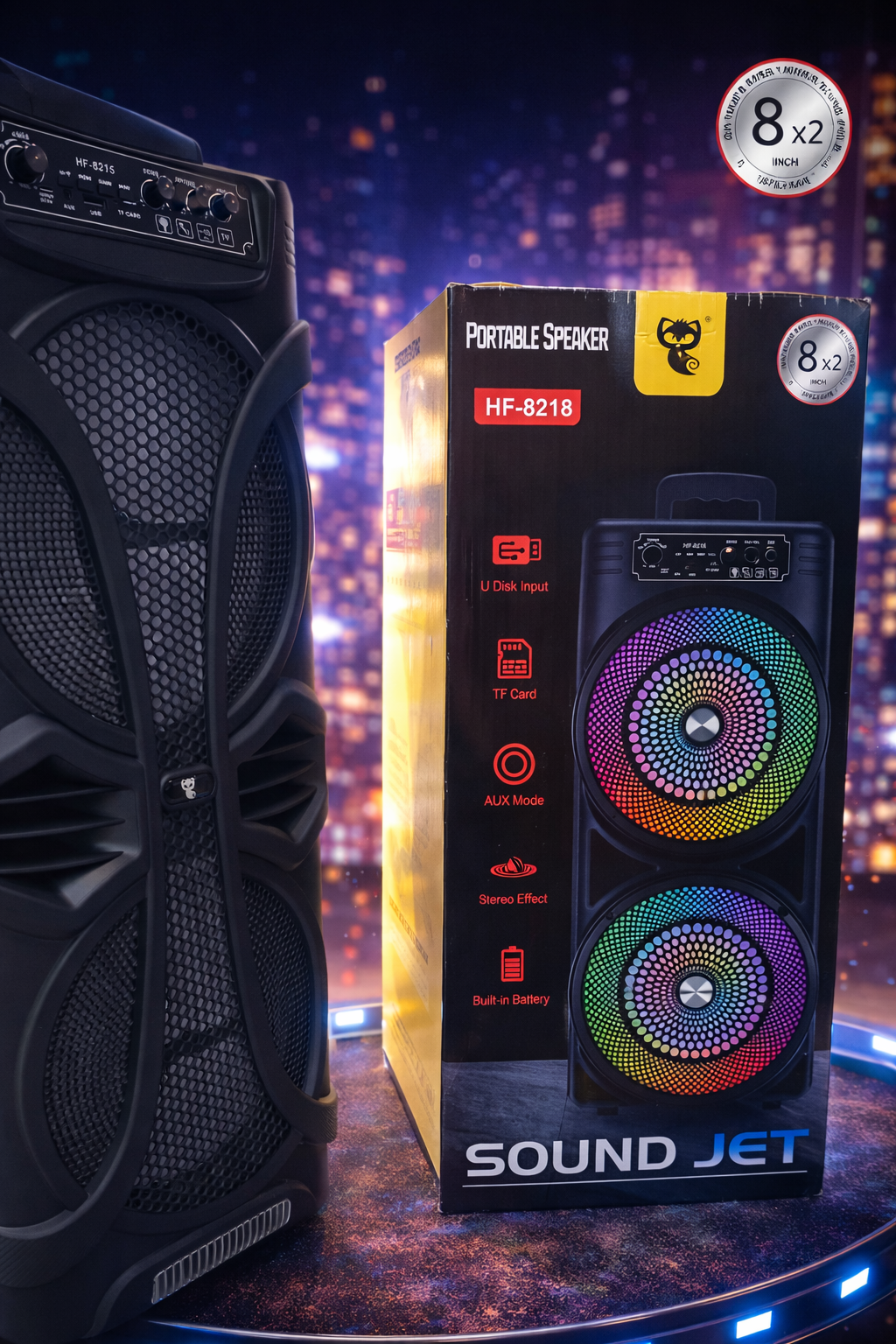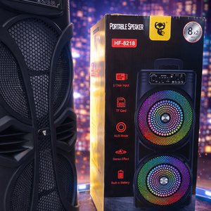 The Sound Jet HF-8218 Portable Speaker delivers powerful sound with vibrant RGB lighting for an immersive audio experience.