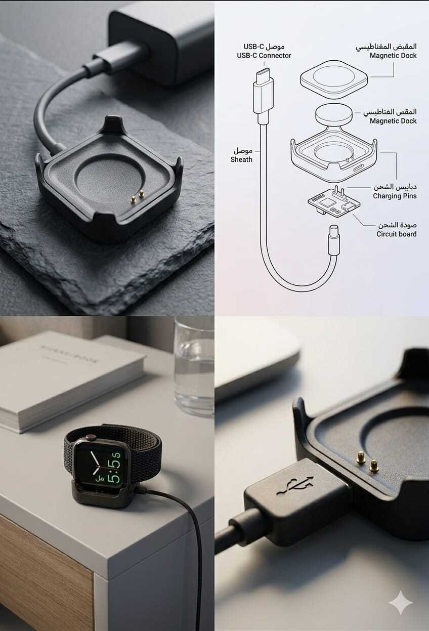 سهولة الاستخدام: لا حاجة لفك سوار الساعة، فقط ضعها على القاعدة وابدأ الشحن فوراً.