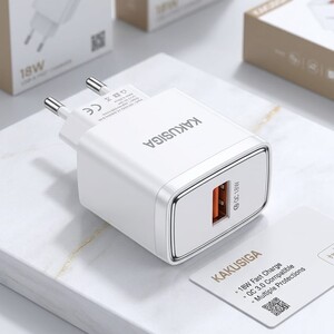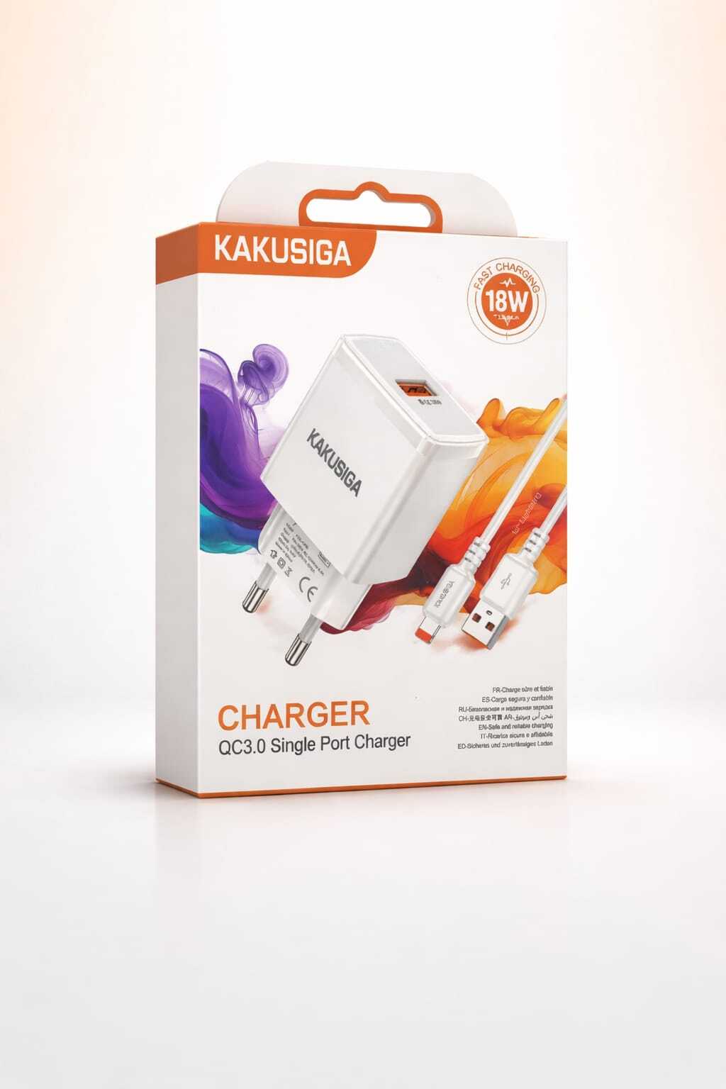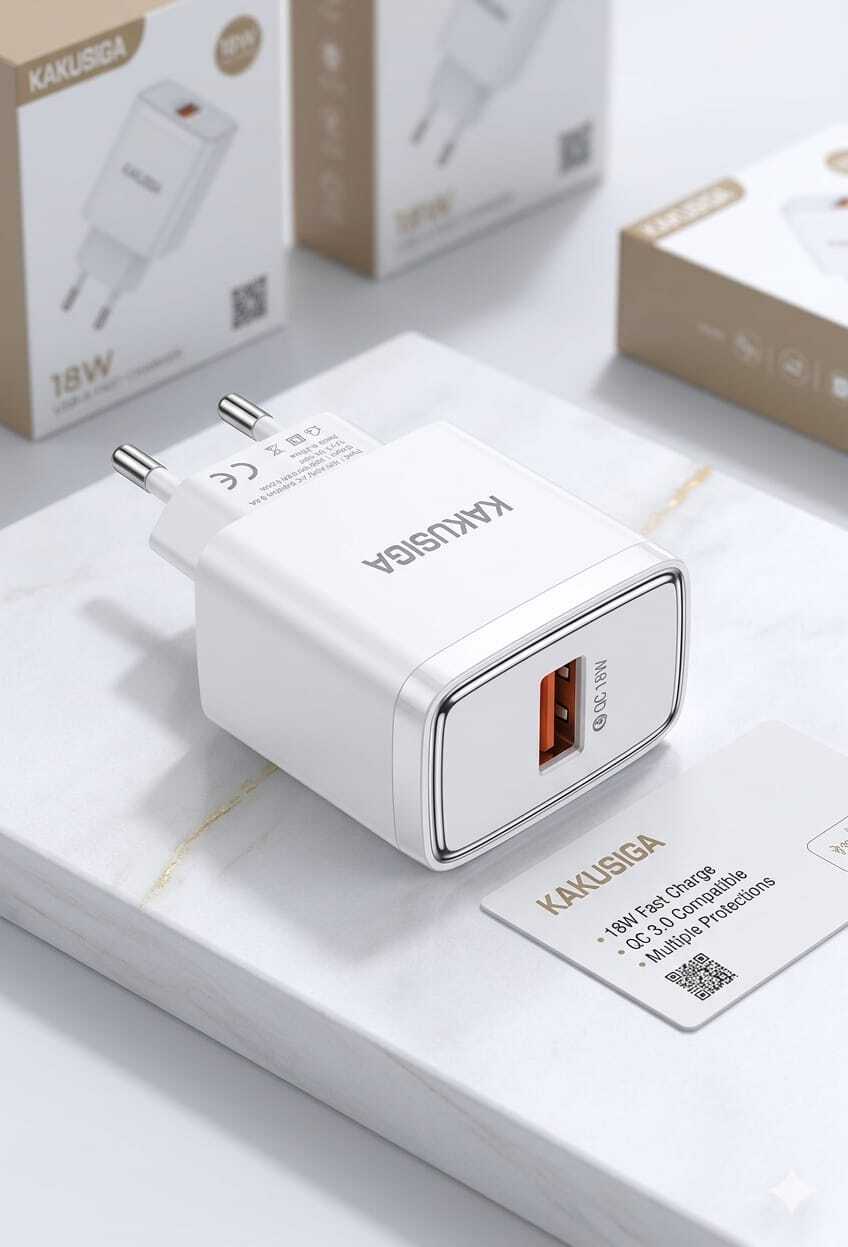 استمتع بتجربة شحن سريعة وموثوقة مع شاحن KAKUSIGA بقوة 18 واط، مزوّد بمنفذ USB وتقنية QC3.0 لتوفير شحن أسرع وكفاءة أعلى. يأتي مع كيبل Lightning مخصص لأجهزة الآيفون، مما يجعله الخيار المثالي للاستخدام اليومي في المنزل أو العمل.