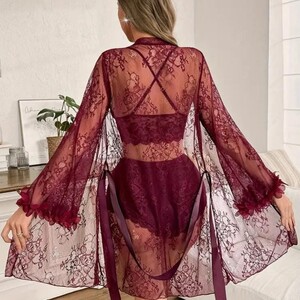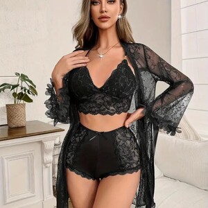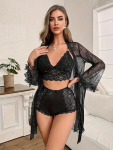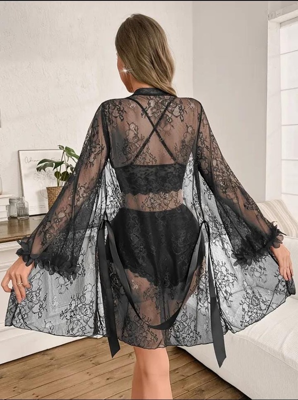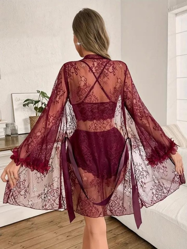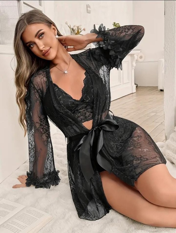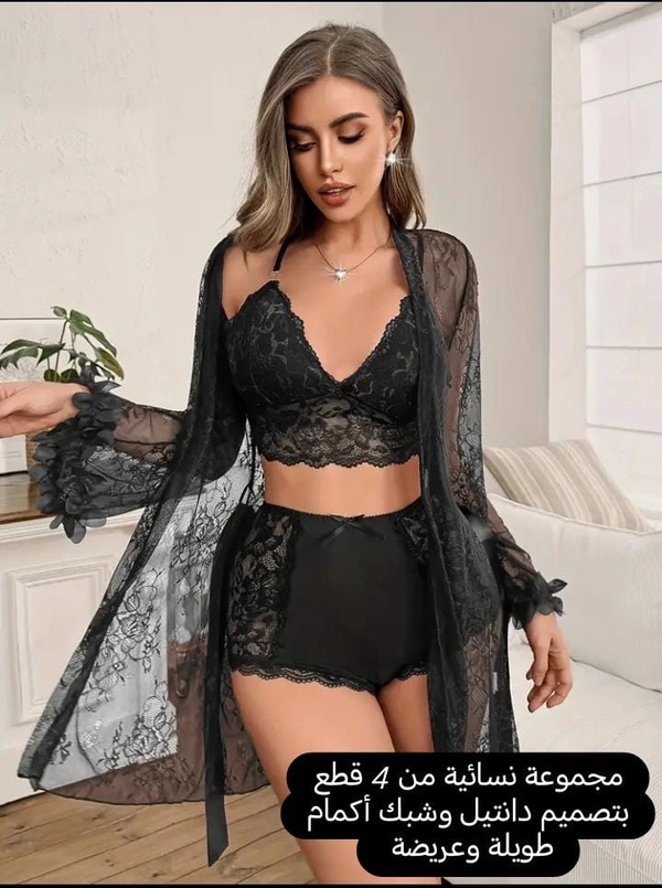 مجموعة نسائية فاخرة من 4 قطع بتصميم دانتيل وشبكة جاكار، تجمع بين الأناقة والراحة. تأتي بقصة أنثوية ناعمة وأكمام طويلة مزينة بأوراق الزهور مع ياقة V جذابة وحزام أنيق، مثالية كهدية فاخرة لعيد الحب أو للاستخدام المنزلي اليومي.