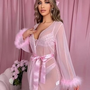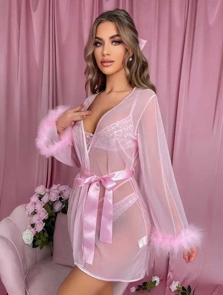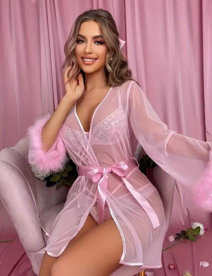 يضم حمالة صدر شفافة بتفاصيل دانتيل ناعمة مع فستان نوم مغري يمنحك لمسة راقية من الجمال والجاذبية.