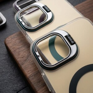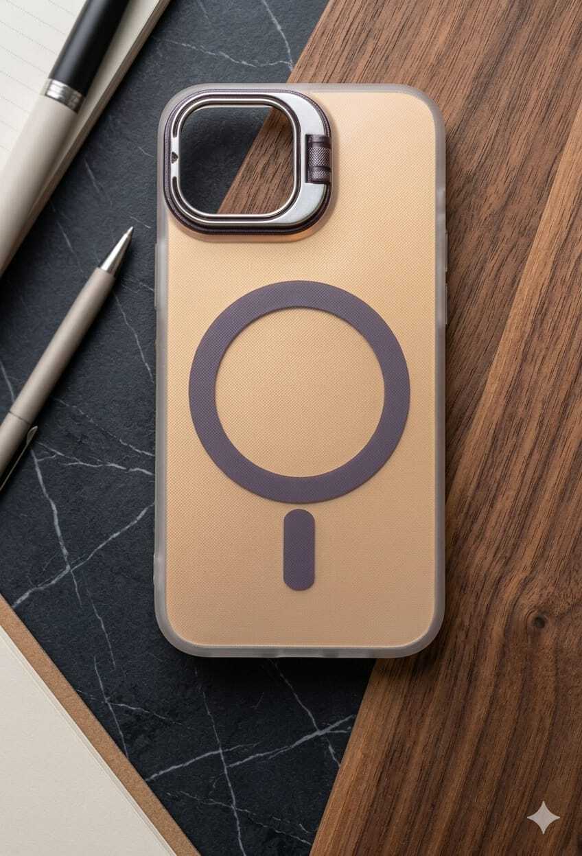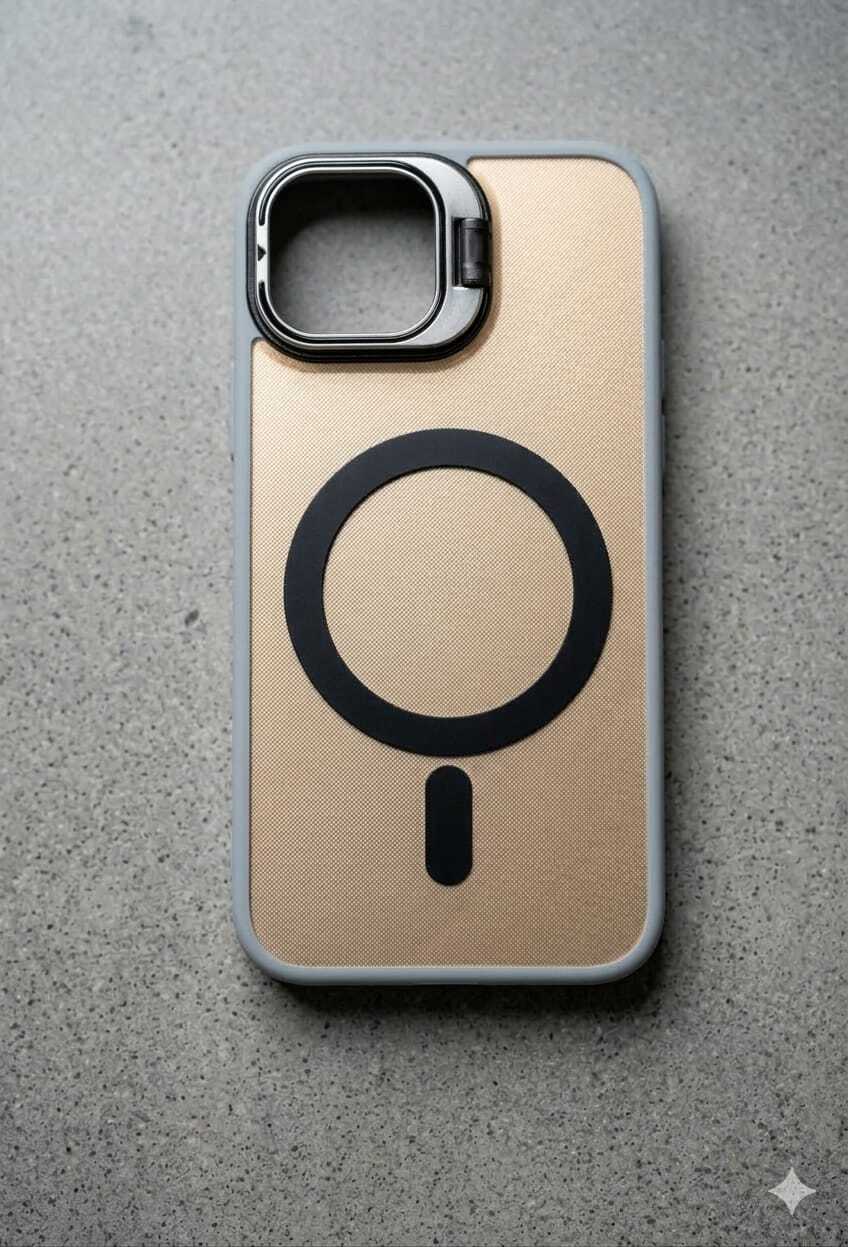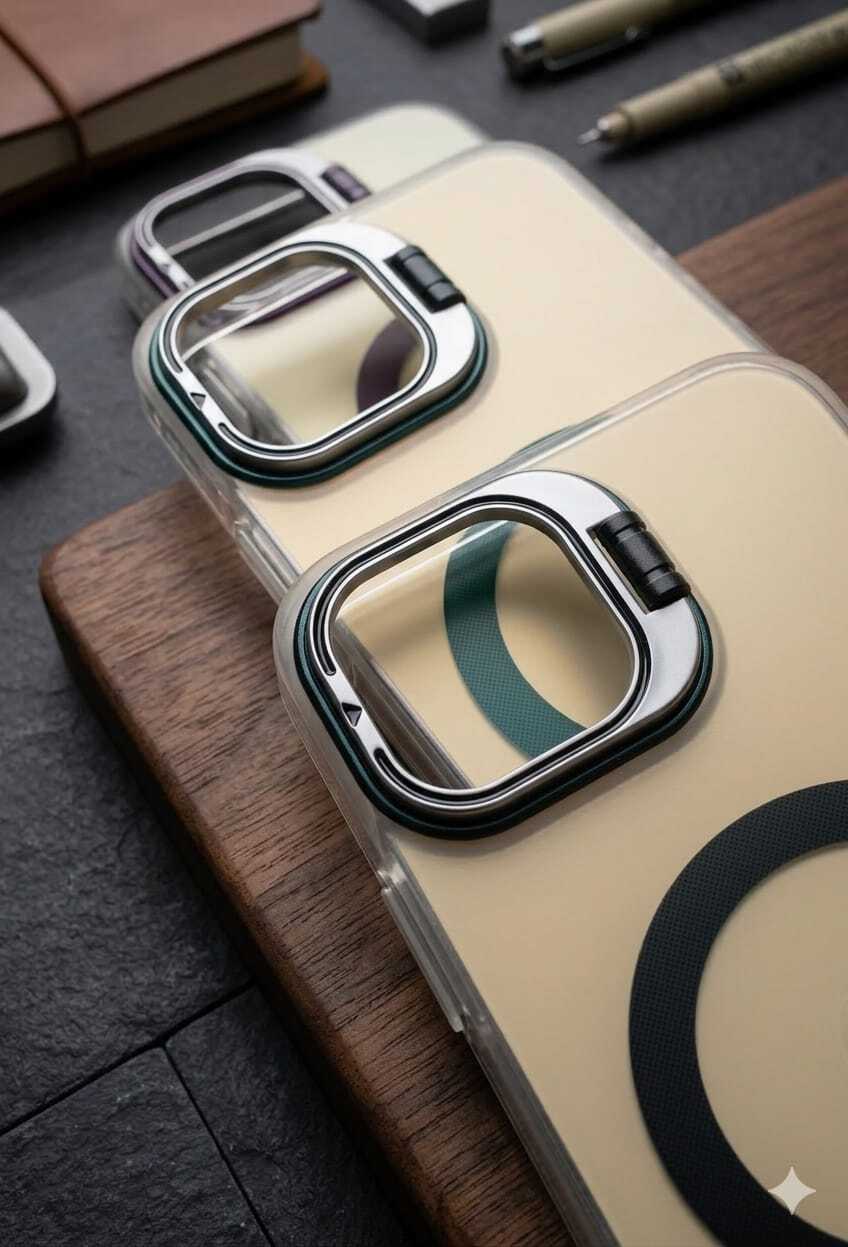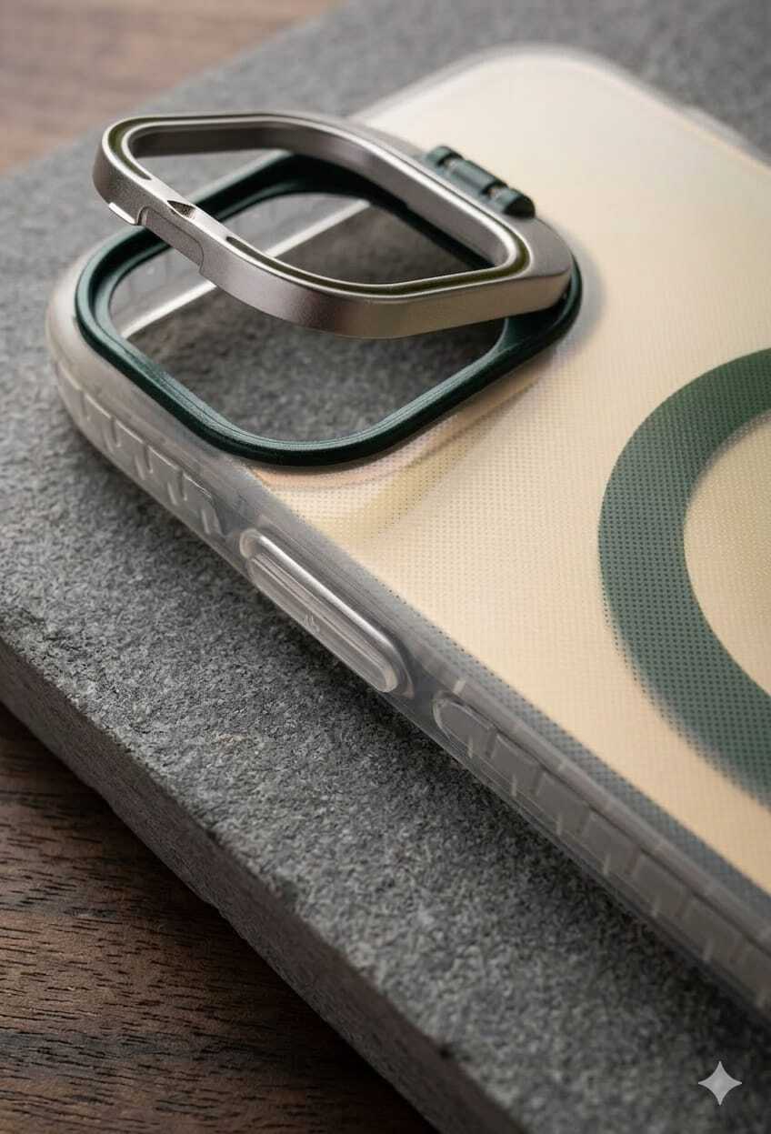 مسند كاميرا مبتكر (2 في 1): الإطار المحيط بالكاميرا ليس مجرد حماية؛ بل هو مسند معدني قابل للطي بزاوية قابلة للتعديل، مما يتيح لك وضع الهاتف بوضعية العرض الأفقي أو العمودي.