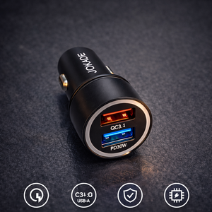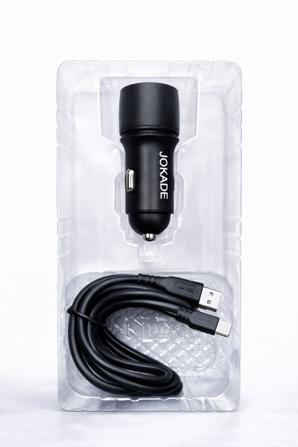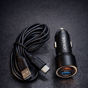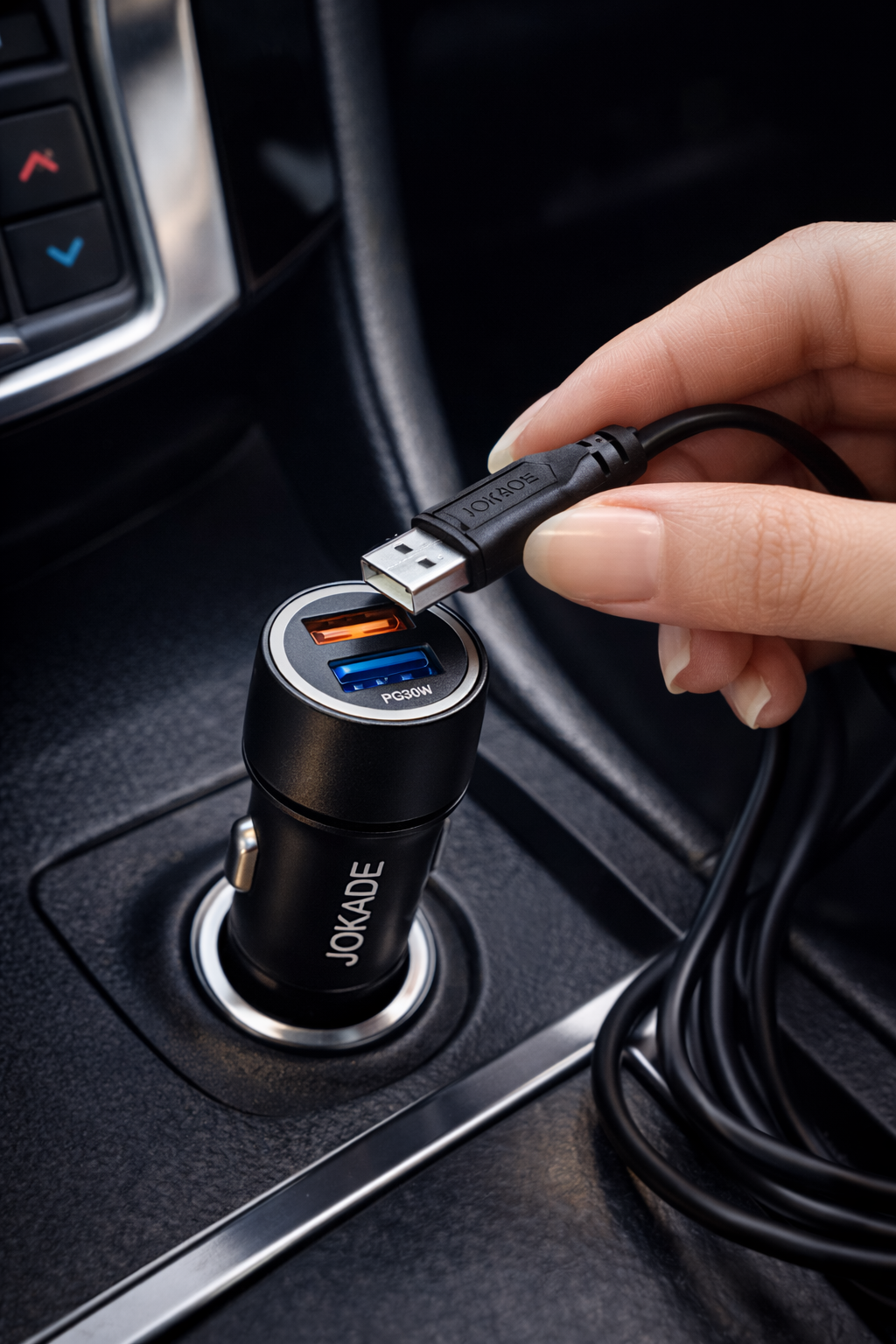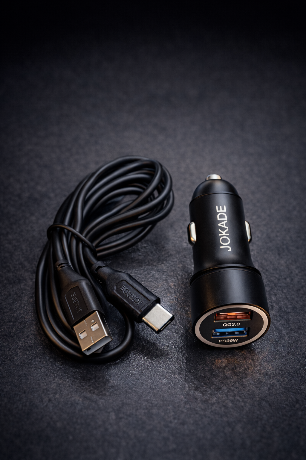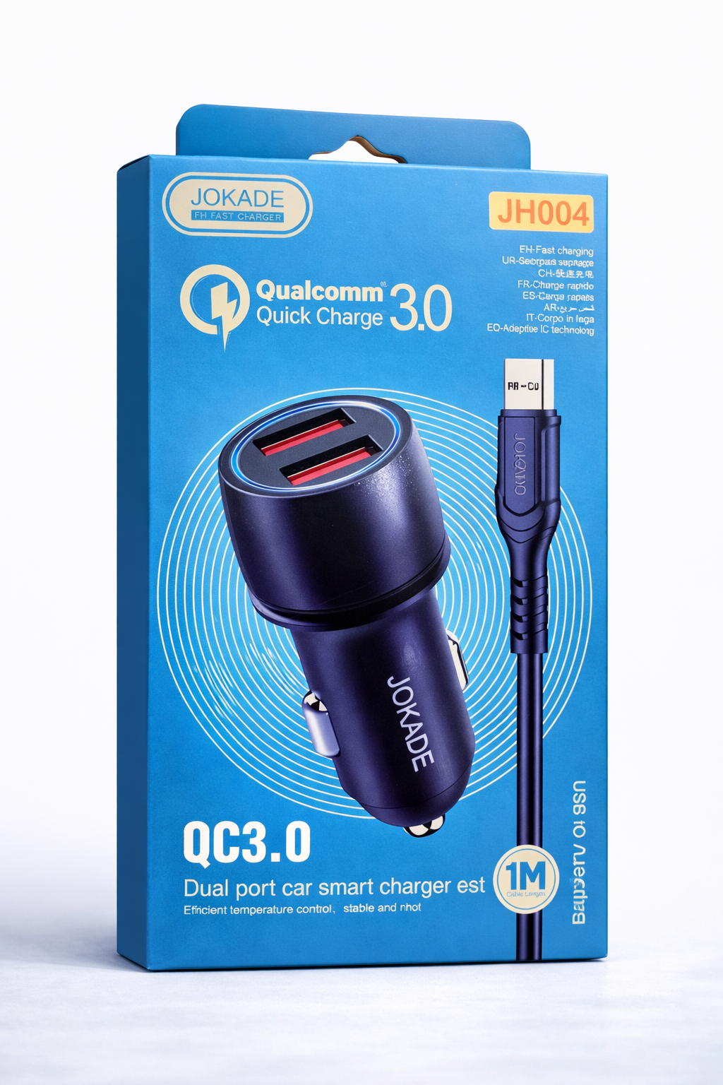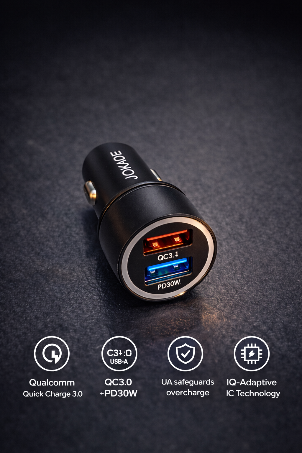 شاحن السيارة الذكي JOKADE JH004 بمنفذين QC3.0 ، شاحن سيارة مدمج وفعال مصمم لشحن الأجهزة بسرعة أثناء التنقل.