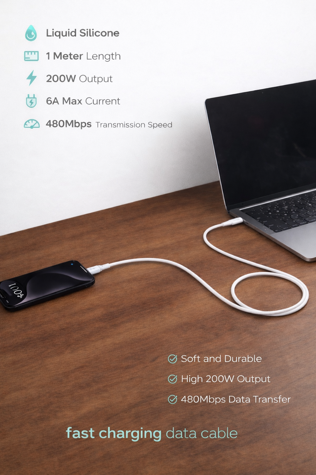 الطاقة العالية: يدعم الكابل شحنًا فائق السرعة بقدرة تصل إلى 200 واط، مما يضمن شحن أجهزتك بكفاءة عالية وسرعة فائقة.