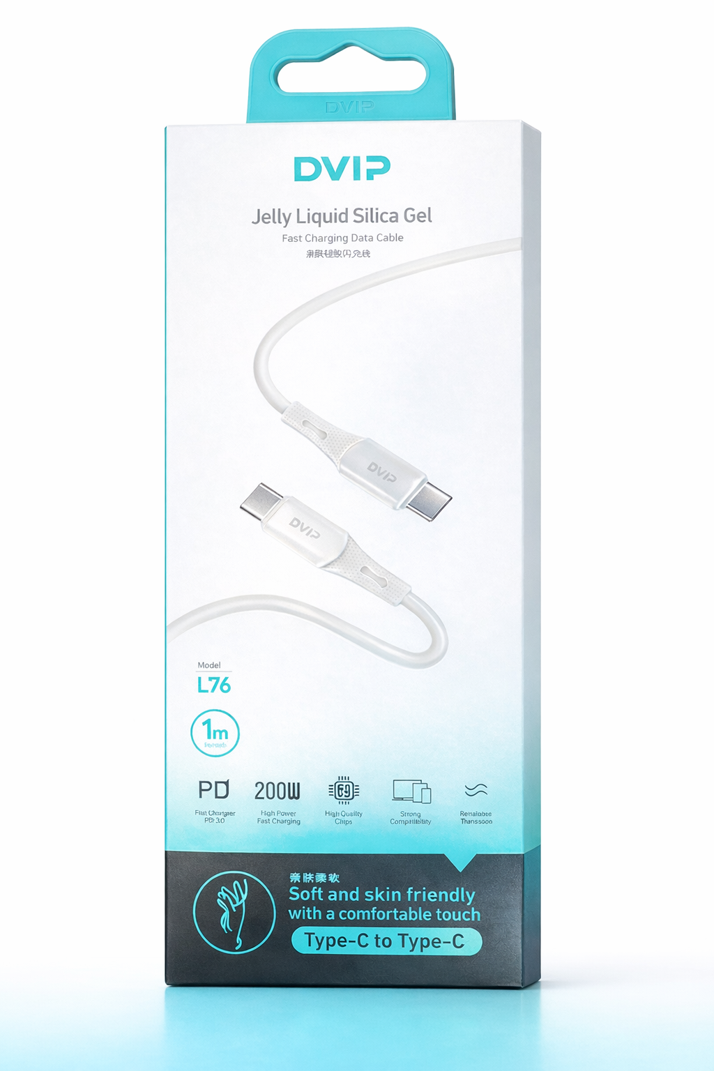 كابل شحن DVIP L76 تايب سي إلى تايب هو كابل عالي الجودة مصمم للشحن فائق السرعة ونقل البيانات، ويتميز بطبقة خارجية من جل السيليكا السائل لملمس ناعم ومقاومة للتشابك.