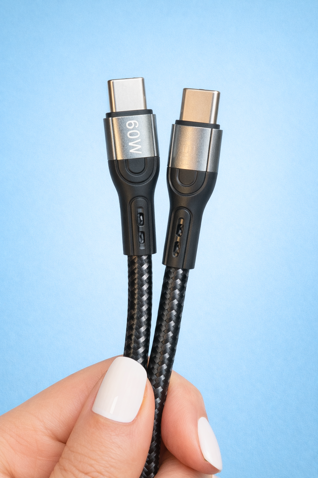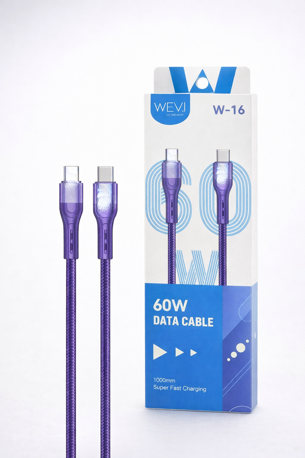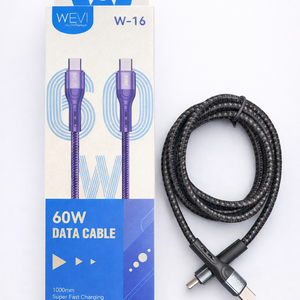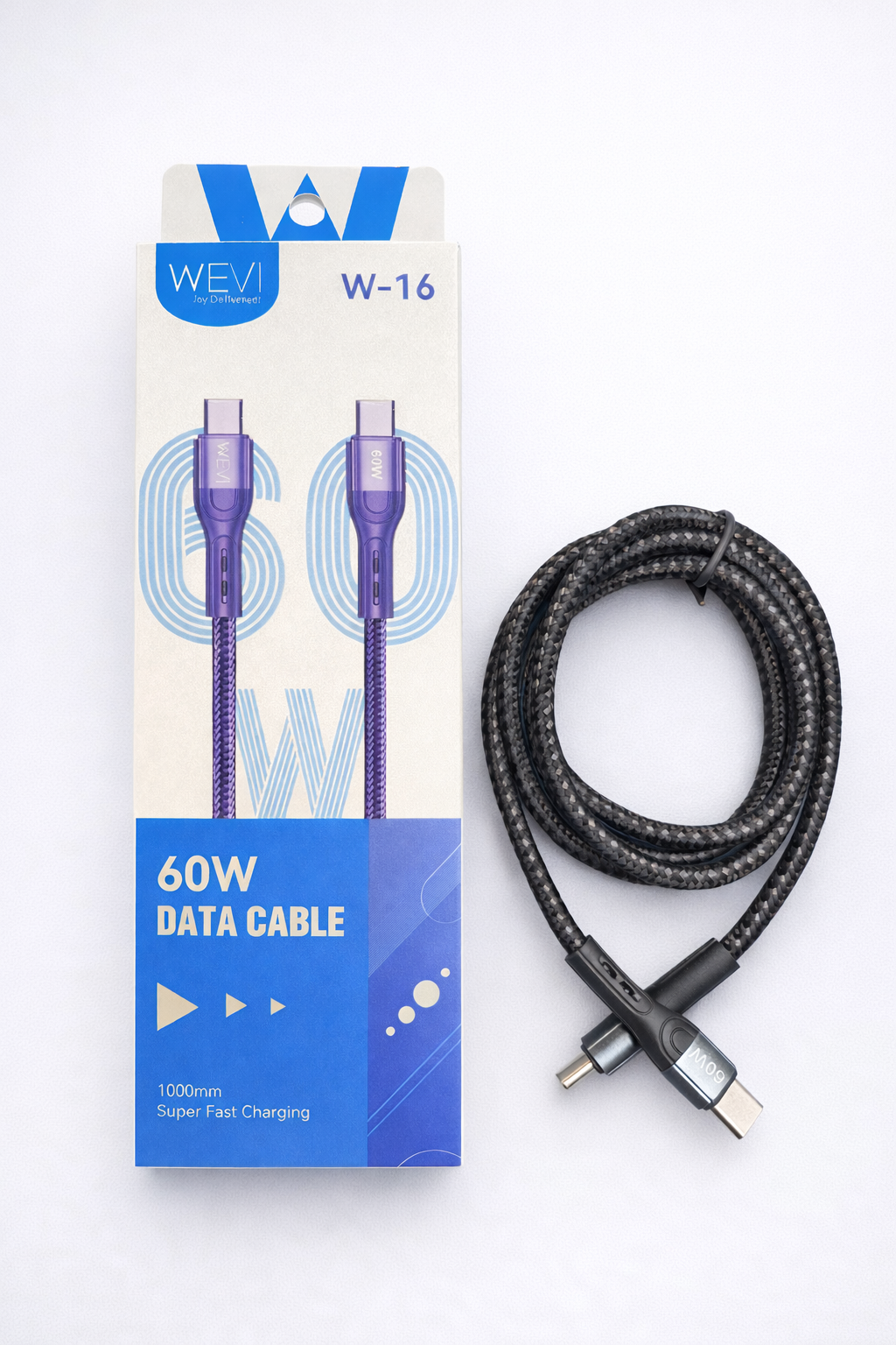 كابل البيانات والشحن فائق السرعة WEVI W-16 60 واط هو كابل متين مصمم لشحن ونقل بيانات فعالين ومتوافق مع مجموعة واسعة من الأجهزة المزودة بمنافذ Type-C، بما في ذلك أجهزة الكمبيوتر المحمولة والأجهزة اللوحية والهواتف الذكية الحديثة.
