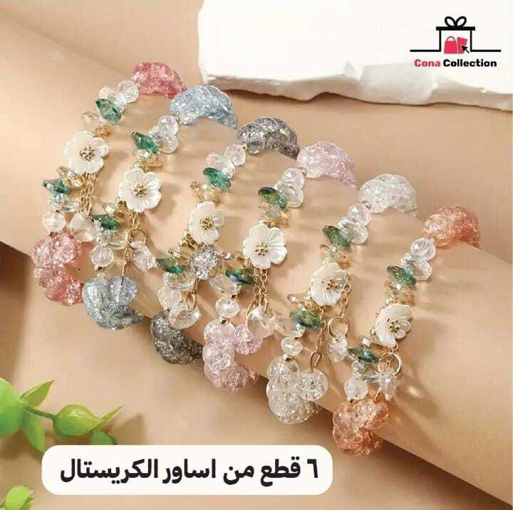 مجموعة 6 قطع أساور مزينة بألوان كريستال وأزهار كريستال وأشرطة هي إضافة رائعة لأكسسواراتك، حيث تتميز بتصاميم أنيقة وعصرية تناسب كل الأذواق.