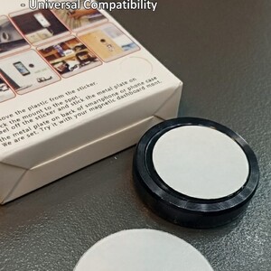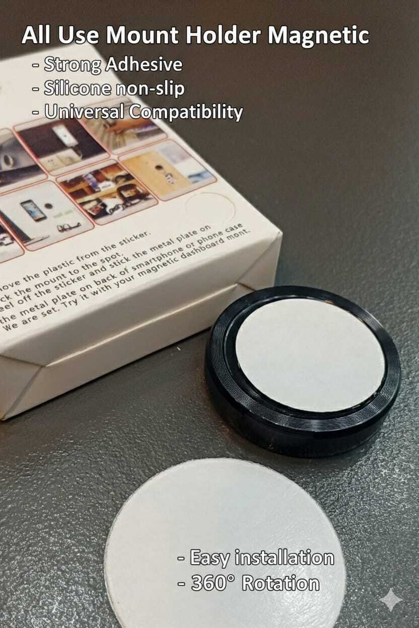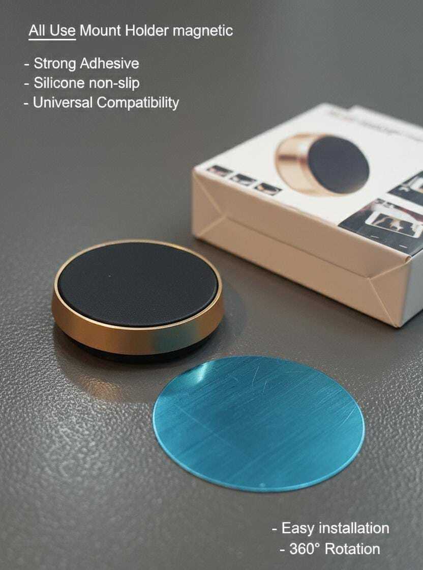 حامل مغناطيسي بتصميم دائري أنيق وعملي، مصمم ليكون متعدد الاستخدامات حيث يمكن تثبيته على لوحة قيادة السيارة، الجدران، أو المكاتب. يتميز بوجود لاصق قوي (Strong Adhesive) في الخلف لضمان ثبات القاعدة، مع سطح سيليكون ناعم يحمي هاتفك من الانزلاق والخدوش. يدعم الدوران بزاوية 360 درجة ويوفر توافقاً شاملاً مع كافة الهواتف الذكية بفضل القطعة المعدنية الملحقة.
