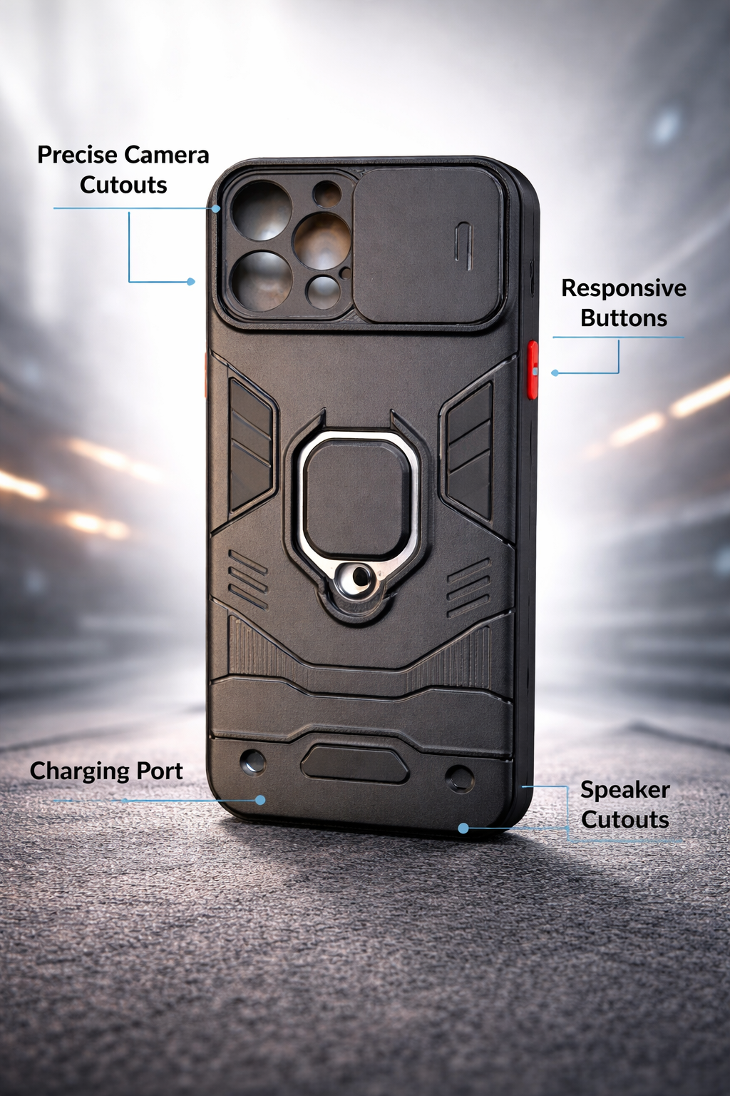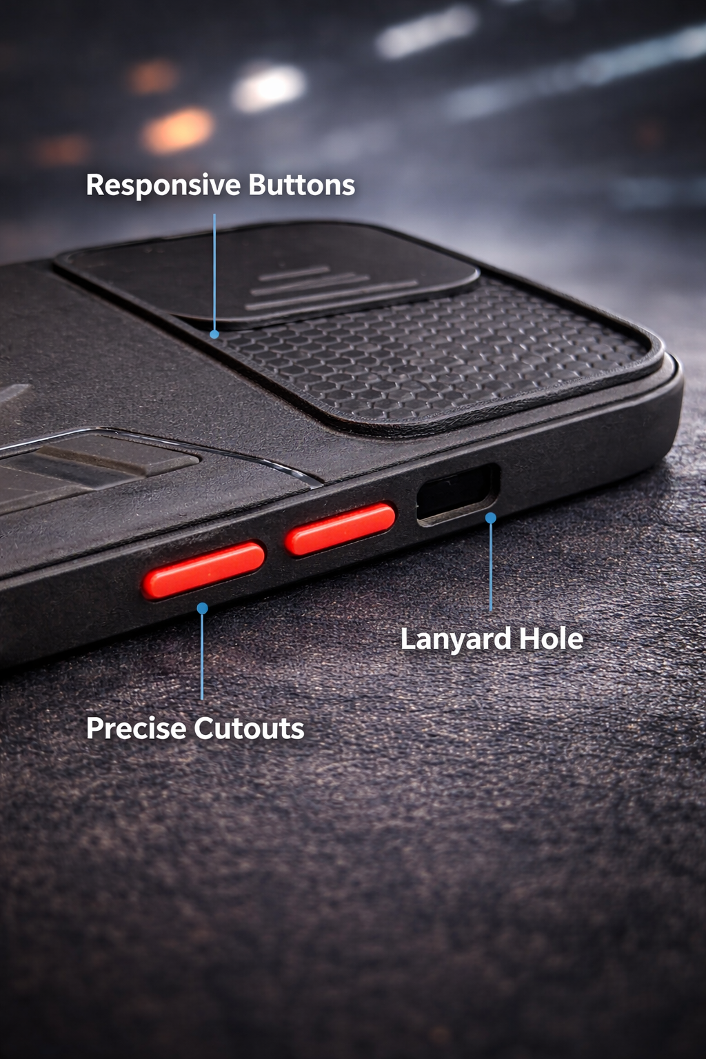 الأزرار الجانبية مصممة بدقة لتكون سهلة الضغط وسريعة الاستجابة، مع فتحات مخصصة تضمن وصولًا سلسًا لجميع المنافذ دون أي عوائق. من الداخل، يأتي بتصميم شبكي ذكي لتقليل تأثير الصدمات وحماية إضافية للهاتف.