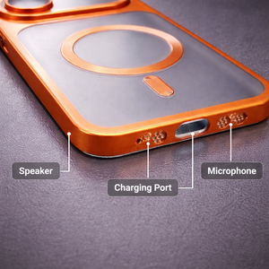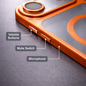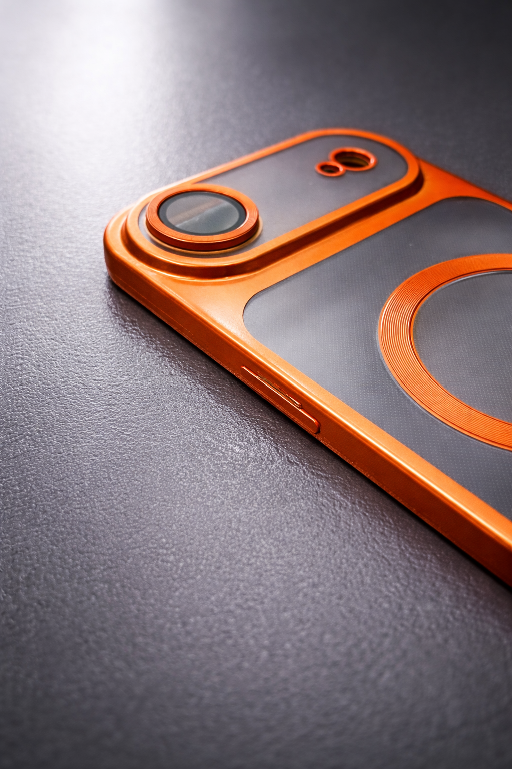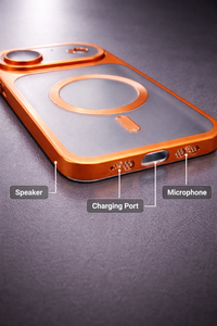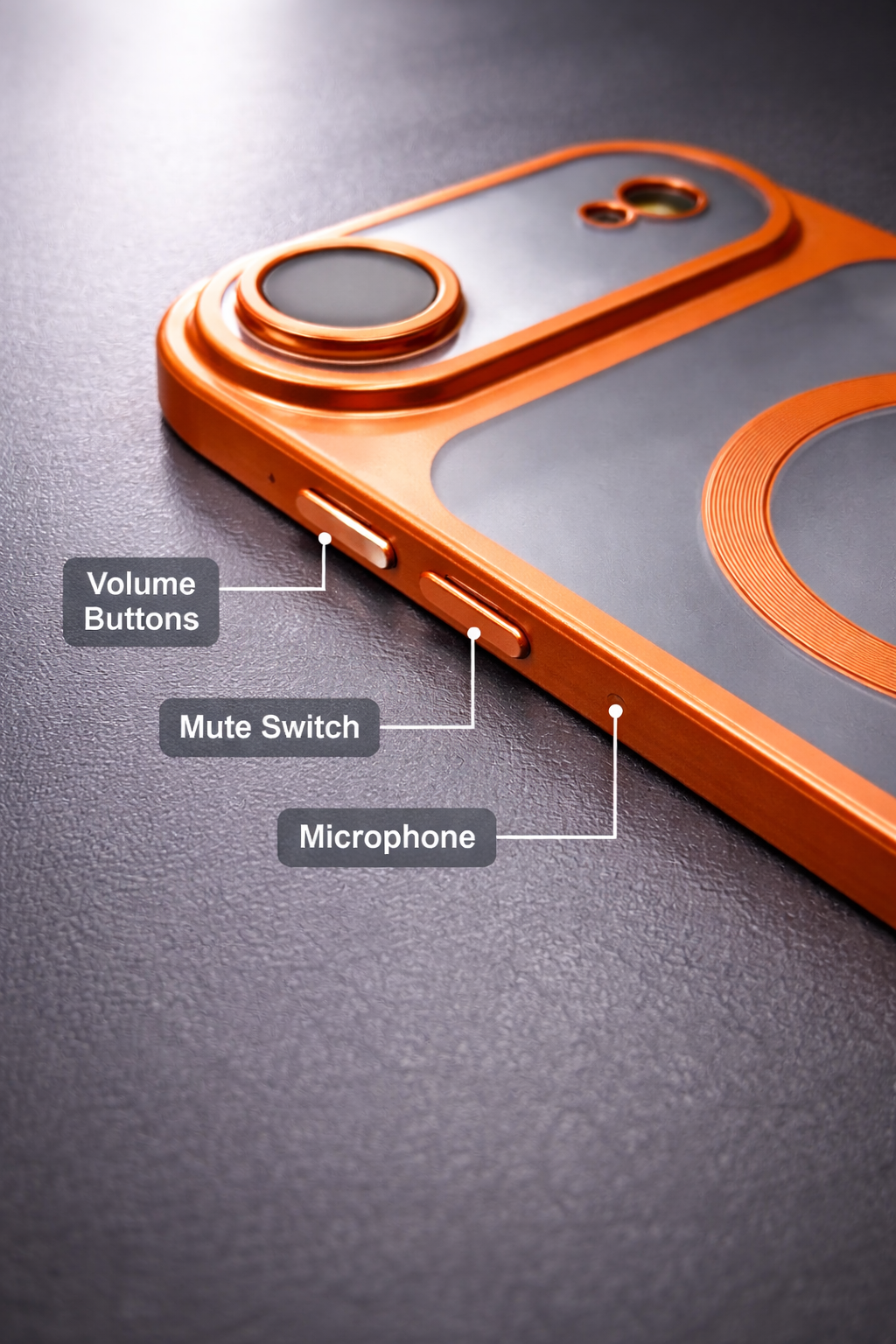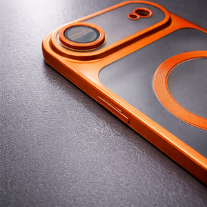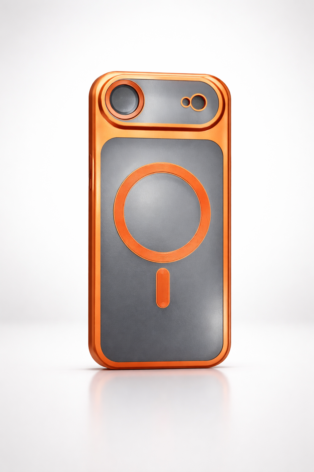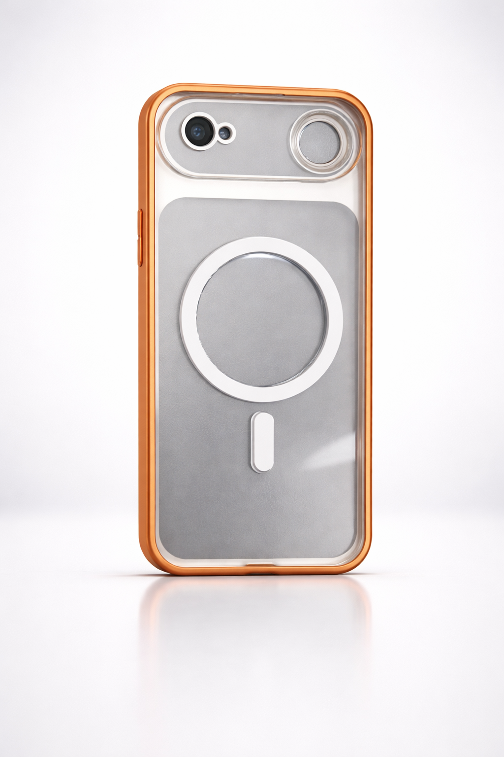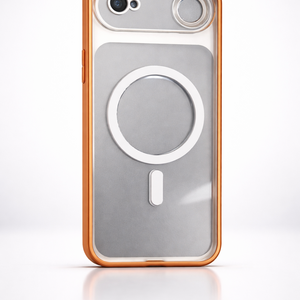 يتميز بإطار معدني بلون برتقالي جذاب مع ظهر شفاف يُظهر جمال جهازك، بالإضافة إلى دعم كامل لتقنية MagSafe لضمان شحن سريع وثبات مثالي للإكسسوارات.