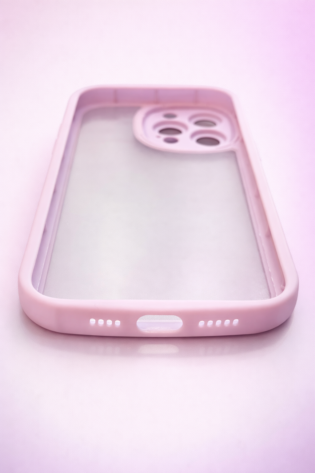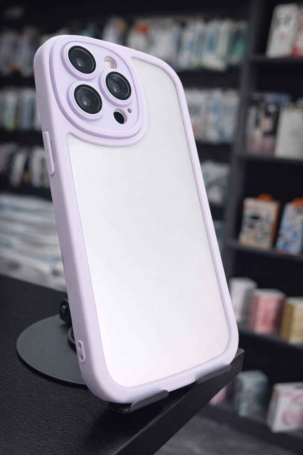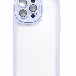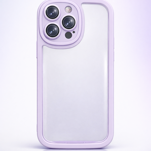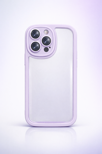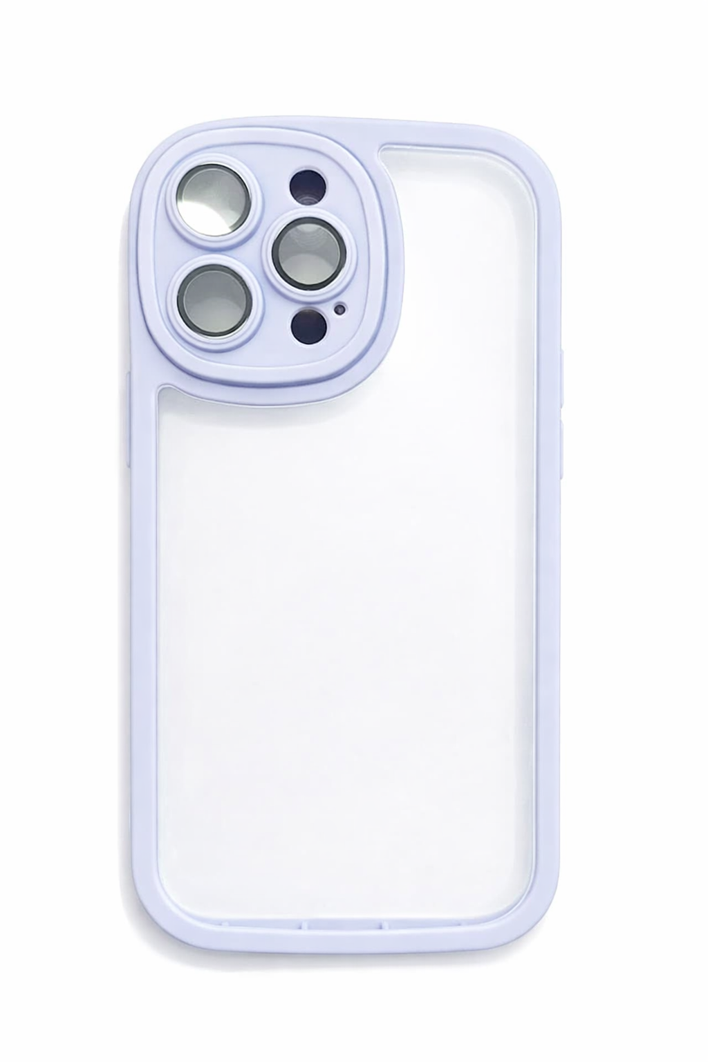 كفر حماية شفاف بإطار سيليكون بلون لافندر ناعم، مصمم ليبرز جمال الهاتف مع توفير حماية متكاملة للكاميرا والحواف. يتميز بحواف مرتفعة حول العدسات لحماية إضافية، وتصميم نحيف يحافظ على شكل الجهاز بدون زيادة حجم.