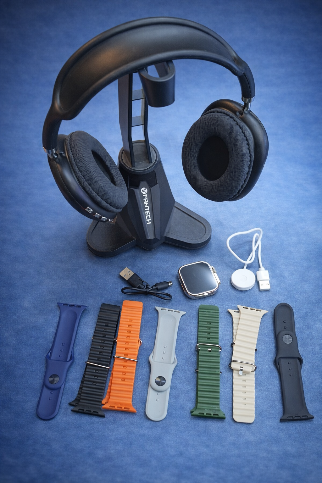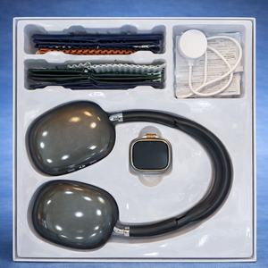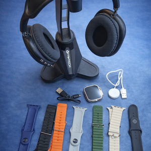 سماعة رأس لاسلكية مريحة بصوت نقي وعزل ممتاز، مع ساعة ذكية بتصميم عصري وشاشة واضحة تناسب الاستخدام اليومي والرياضي.