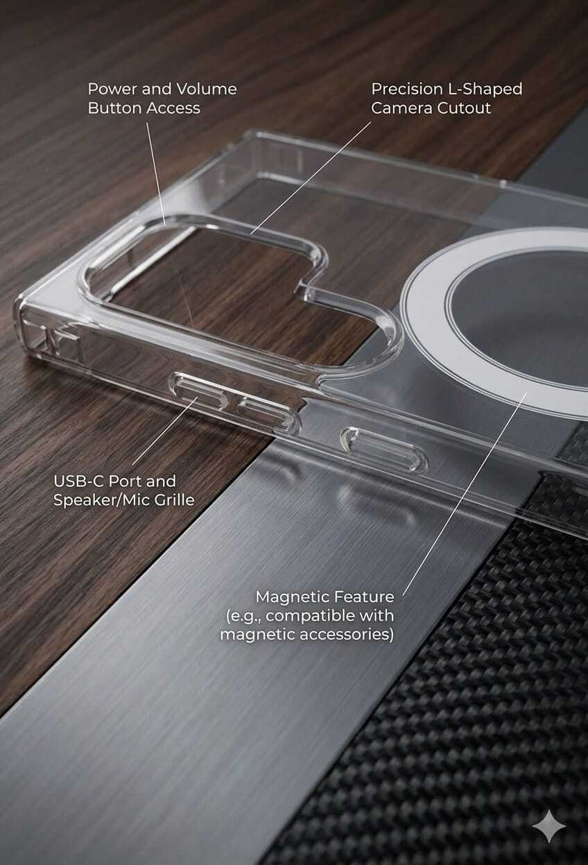 سهولة الوصول: فتحات دقيقة لجميع المداخل (USB-C) ومكبرات الصوت، مع أزرار جانبية سريعة الاستجابة توفر لك تجربة استخدام سلسة وكأنك تلمس الهاتف مباشرة.