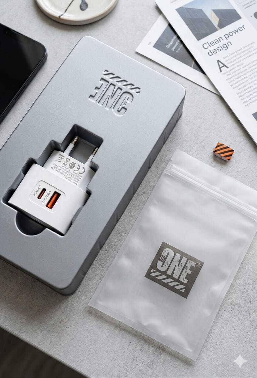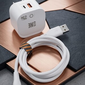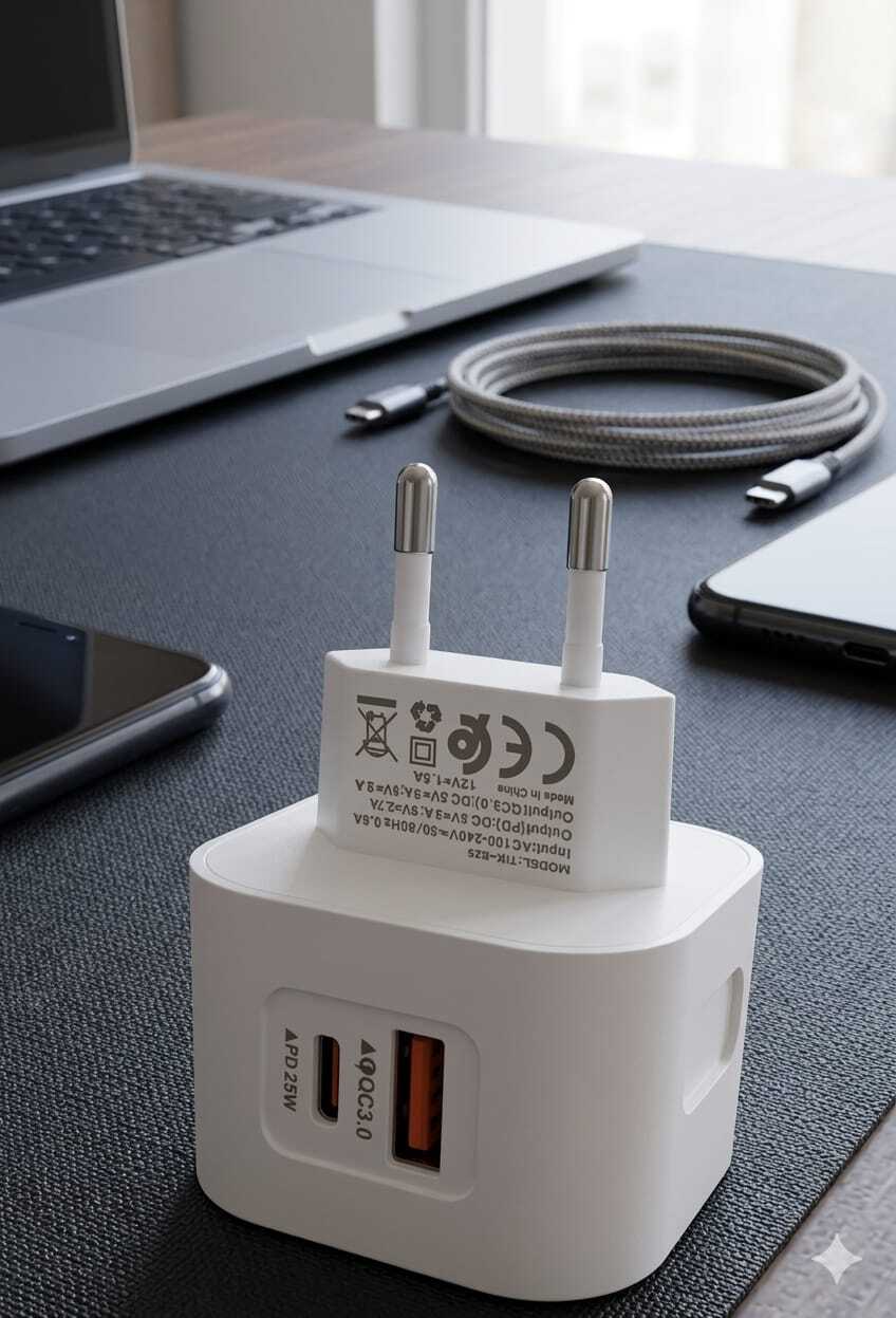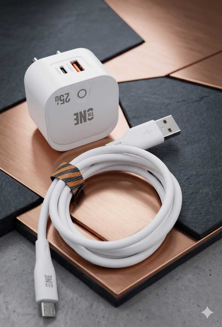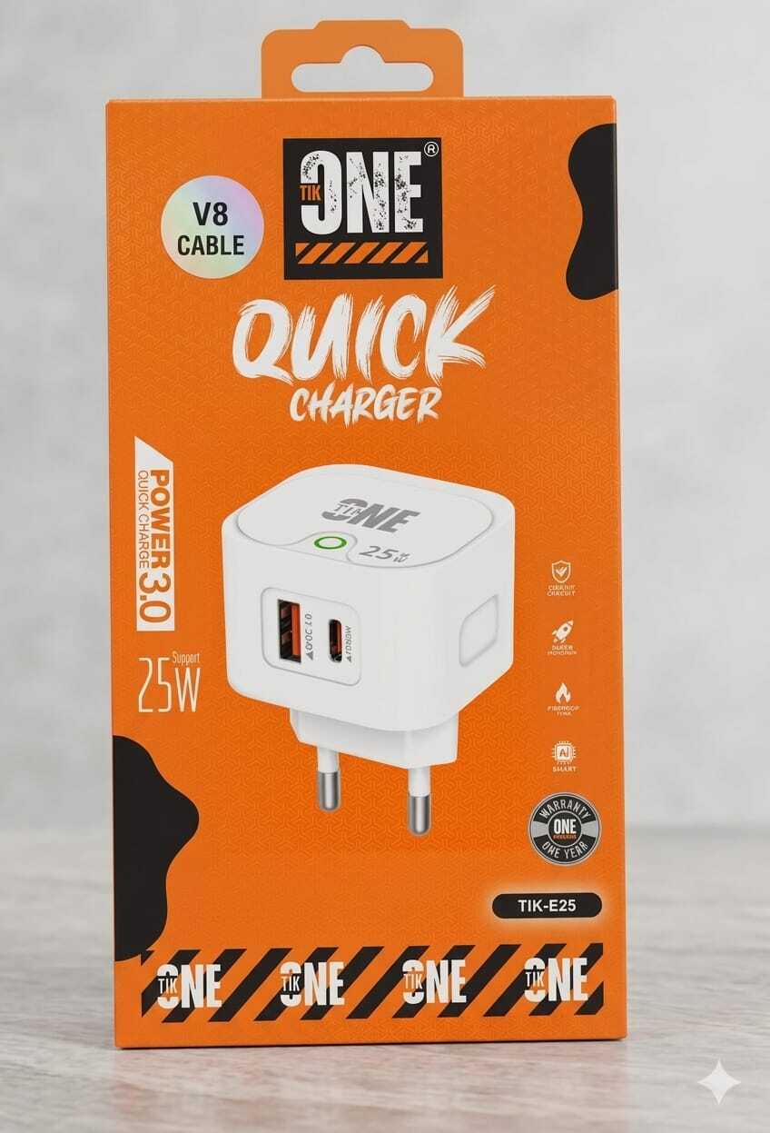 “لا تخلي يومك يوقف عند شحن البطارية! مع شاحن TIK-ONE بقوة 25 واط، اشحن أجهزتك بسرعة الصاروخ وبأمان تام. منفذين شحن يعني تشحن جوالك وسماعتك بنفس الوقت. اطلبه الحين وخليك دايمًا متصل!