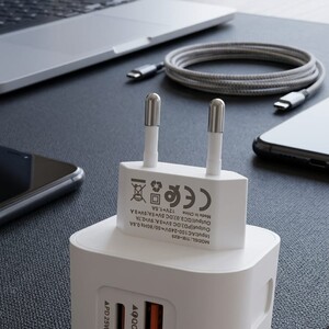 منفذ مزدوج: يحتوي على منفذين (USB-A بتقنية QC 3.0) و (USB-C بتقنية PD) لشحن جهازين في وقت واحد.