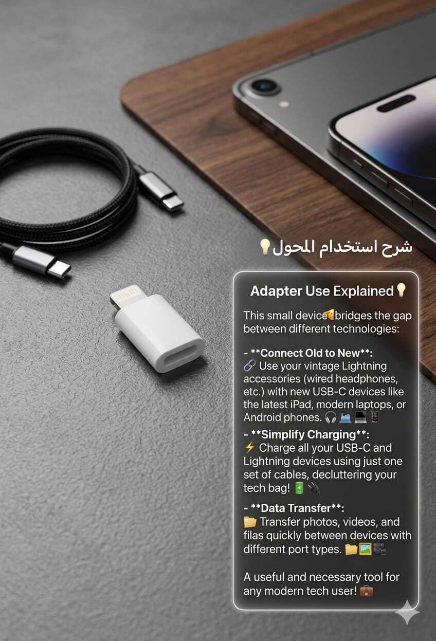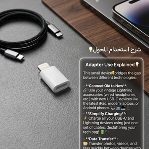 هذا المحول هو الجسر المثالي بين ملحقات USB-C الحديثة وأجهزة Apple التي تعمل بمنفذ Lightning. تم تصميمه ليوفر لك أقصى درجات الراحة دون الحاجة لشراء كابلات إضافية.